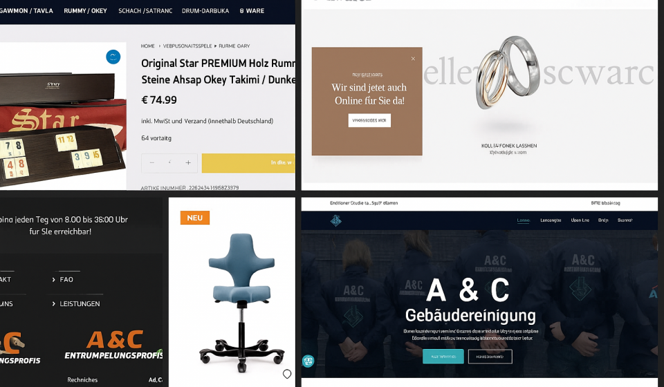 Webdesign Webseiten im Kundenauftrag Von Maximilian Beyer Semus-Shop Link: https://semus-shop.de Ruhe Insel Bürostühle Link: https://ruhe-insel.de Juwelier Schwarcz Link: https://juwelier-am-hochrhein.de A&C Entrümpelungsprofis Link: https://aundc-entruempelungsprofis.de A&C Gebäudereinigung Link: https://aundcgebaeudereinigung.de A&C Malerarbeiten Link: https://aundc-malerarbeiten.de/ Inhaltstabelle Semus-Shop Ruhe Insel Bürostühle Juwelier Schwarcz A&C Entrümpelungsprofis A&C Gebäudereinigung A&C Malerarbeiten Projekt teilen Link Copied!